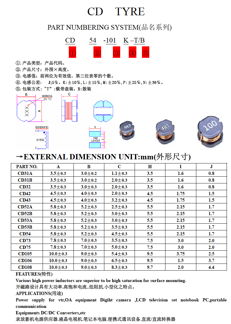 產品簡介:特性:大功率,高飽和電流,低阻抗。適合表面貼裝