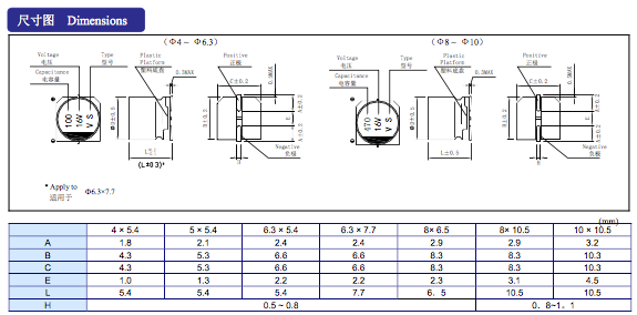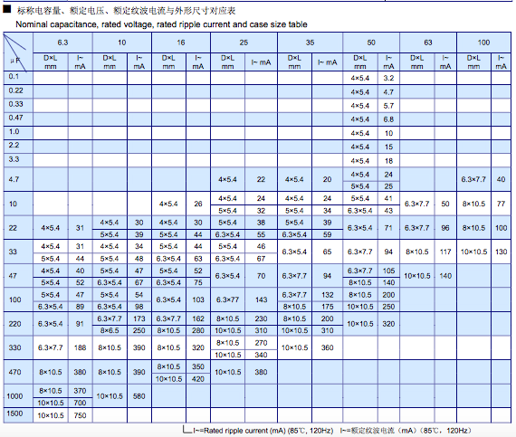 1-1貼片電解電容適用于電腦主版,車載,移動DVD,遙控器,多媒體收音機,多媒體音箱等! 1-2常規溫度,85℃,2000小時壽命,適用電子線路中。 1-3貼片鋁電解電容通常起濾波、旁路、耦合、去耦、轉相等電氣作用,是電子線路必不可少的組成部分。 標準品VS系列 A,適用于回流焊 B,性能穩定,高可靠性 C,適用于高密度表面貼裝 D,壽命-40℃~-85 ℃,2000H E, 體積:4*5.4 5*5.4 6.3*5.4 6.3*7.7 8*10.5 10*10.5 F, 容量:0.1UF-1500UF G, 耐壓:6.3V-100V